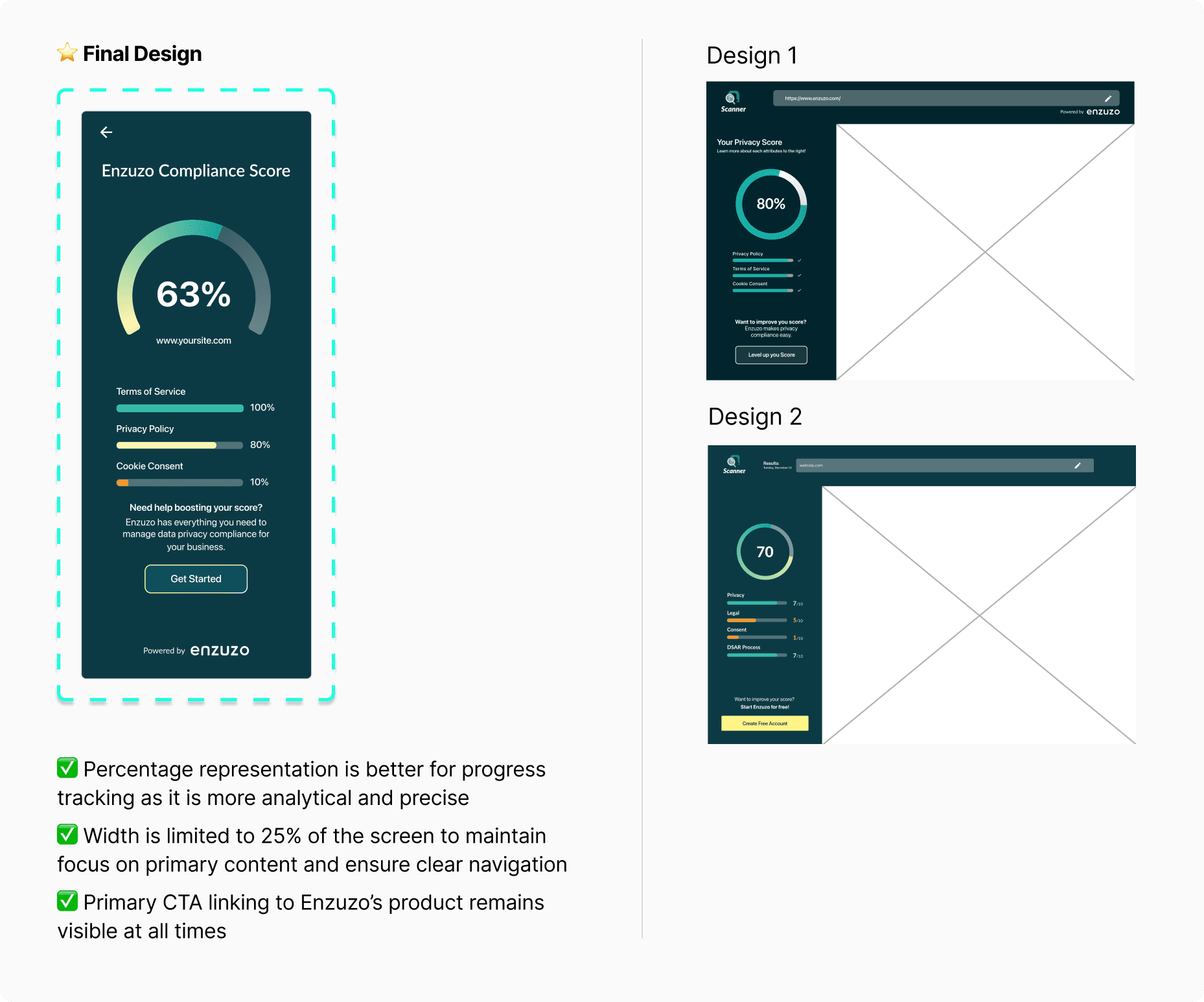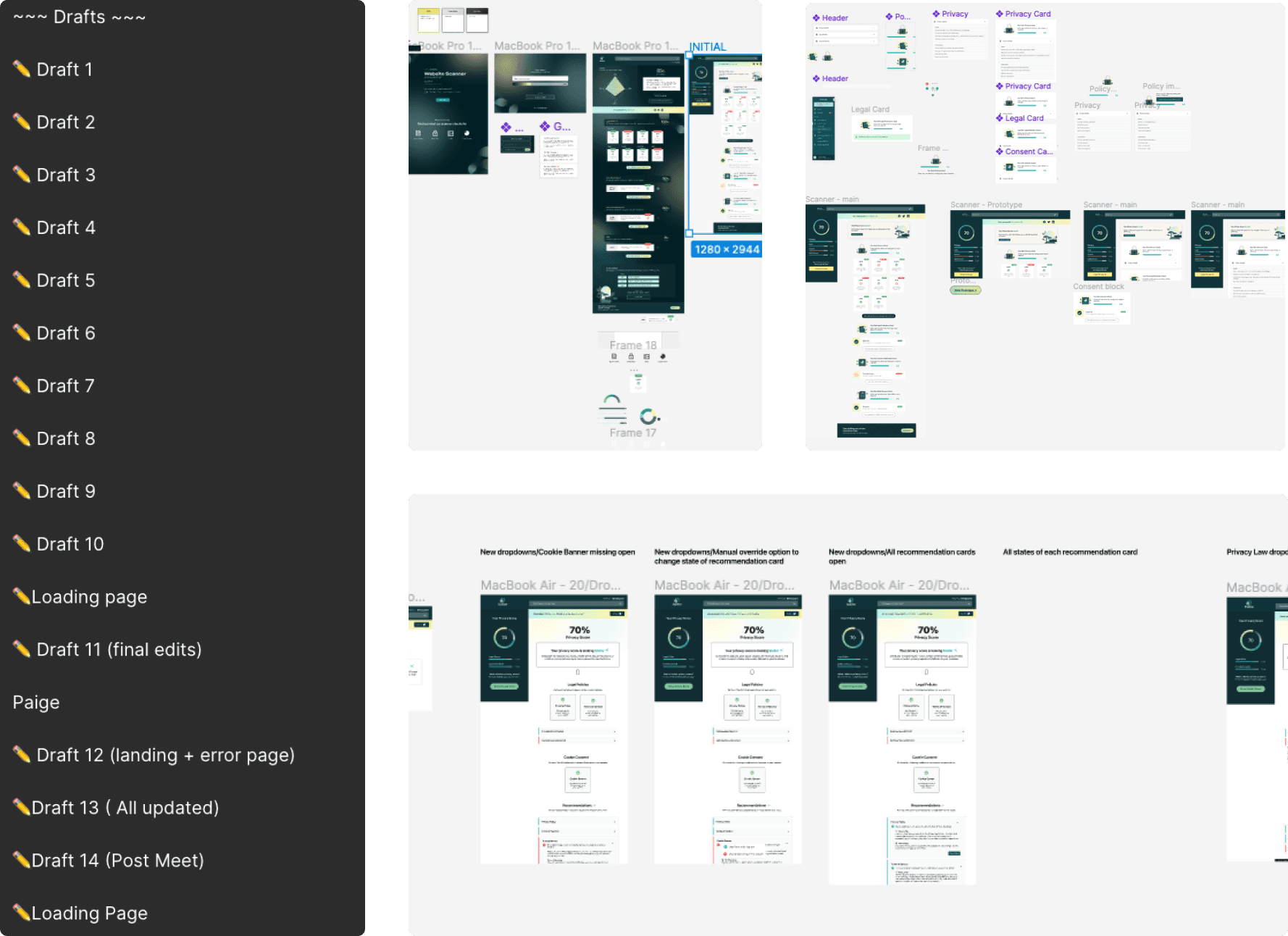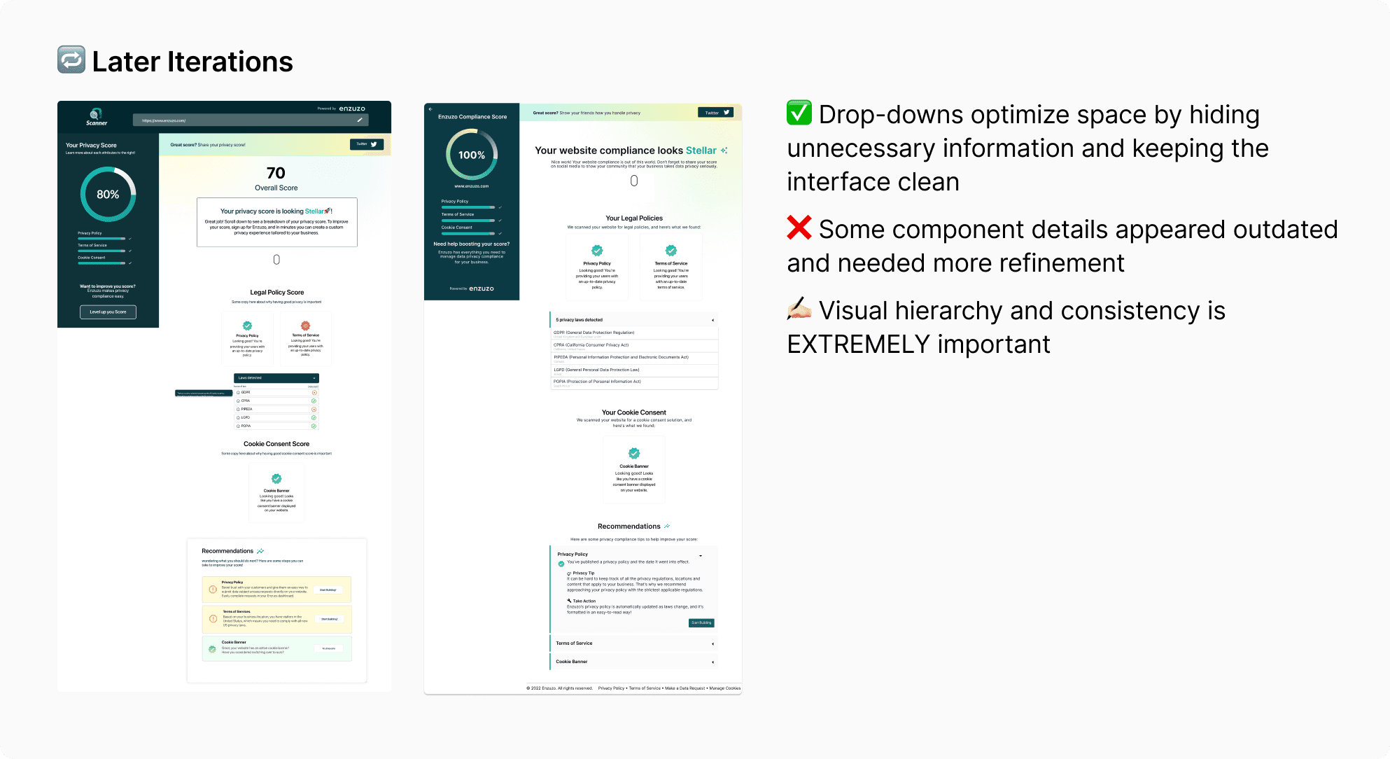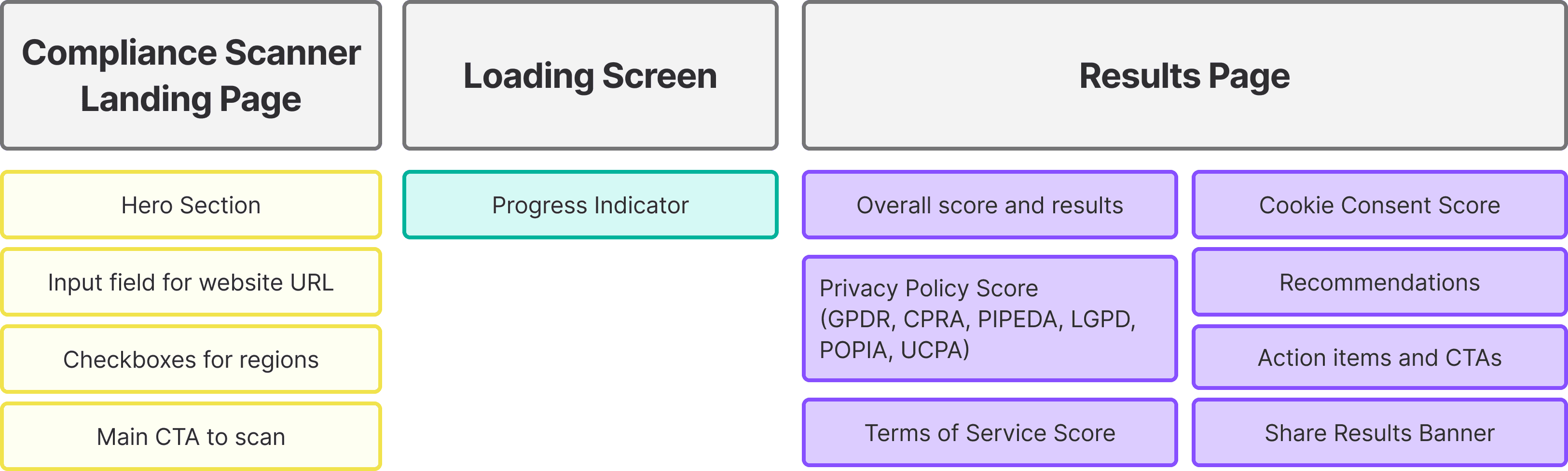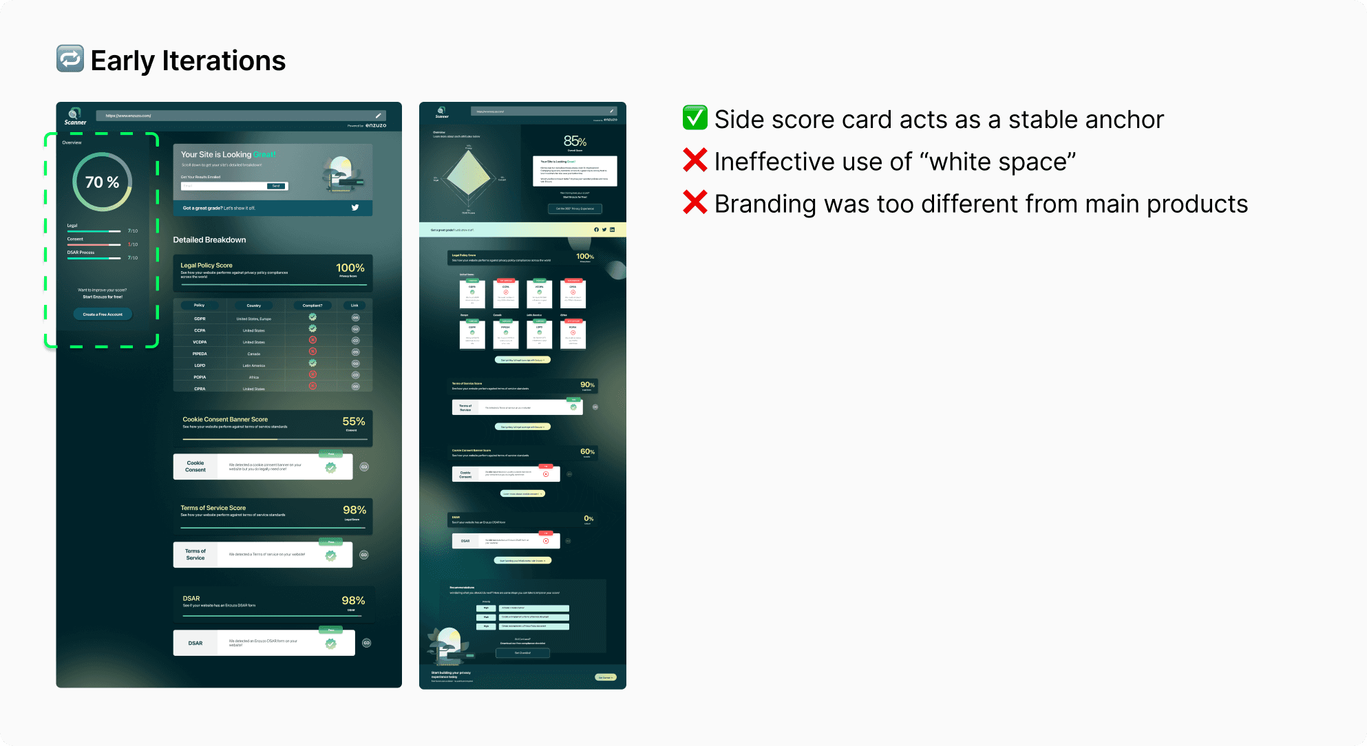 I spearheaded the design and product vision of their newest product, working alongside another product designer and the engineering team. Ultimately, the scanner was created to help fulfill both business and user goals. It analyzes an e-commerce website by parsing the frontend to identify key components such as cookie banners, terms of service, and privacy policies, elements that are essential for ensuring a site meets compliance requirements.