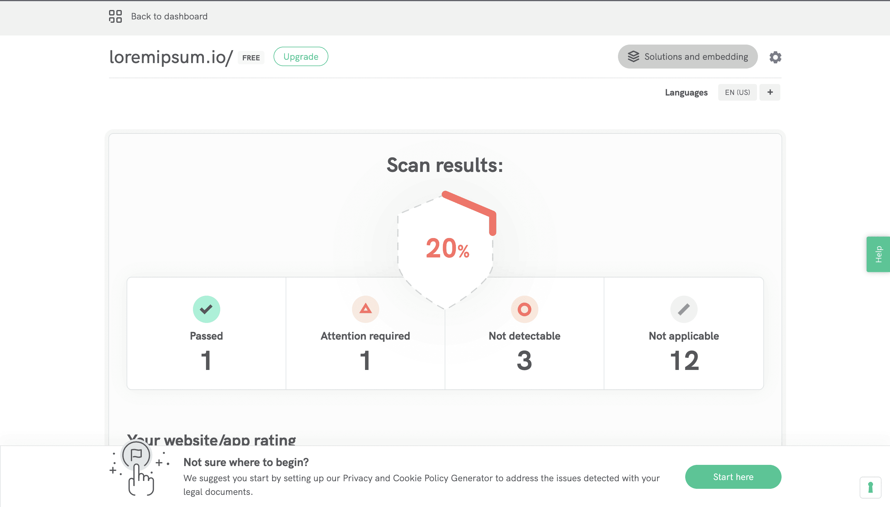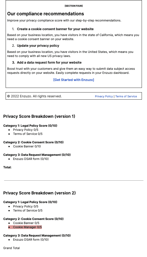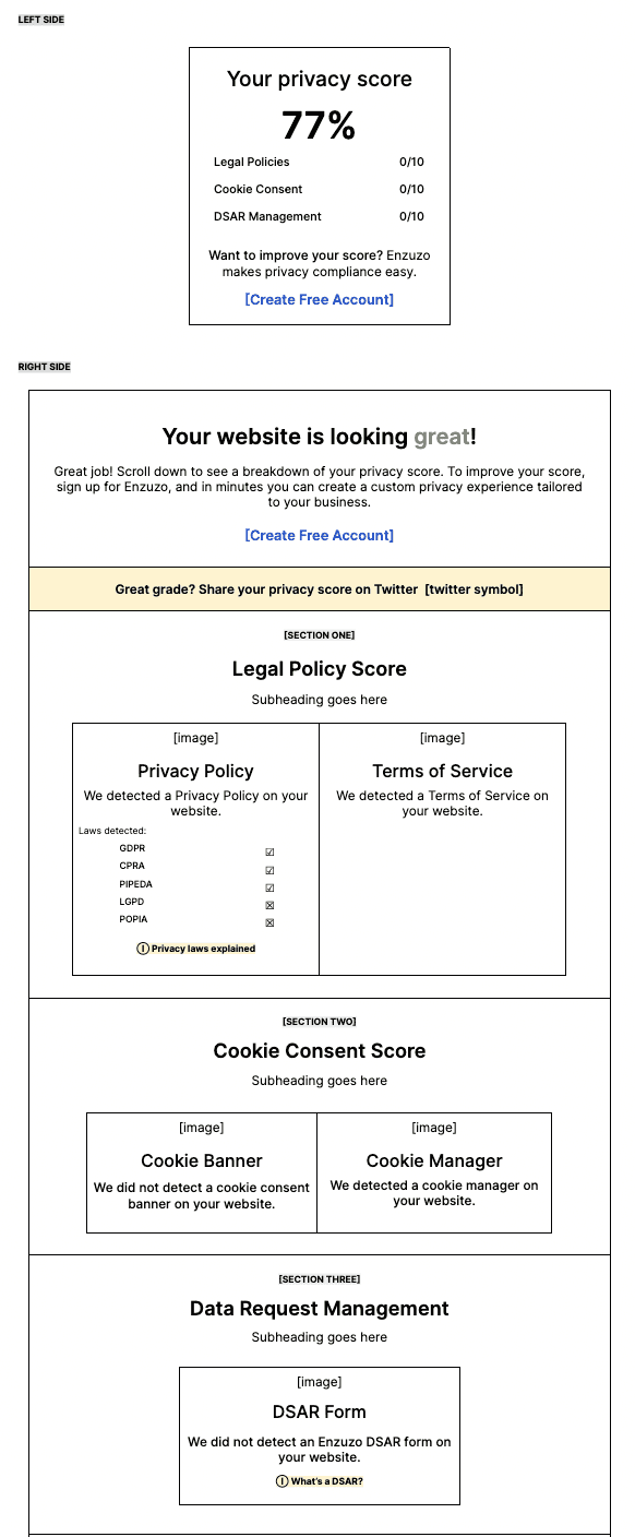 For each privacy law, there are result cards indicating whether the user's website fulfills the requirements in that specific region. Consequently, two distinct states exist, as demonstrated below. Depending on the state, there are accompanying CTAs provided to equip the user with resources that can assist them in enhancing their score.