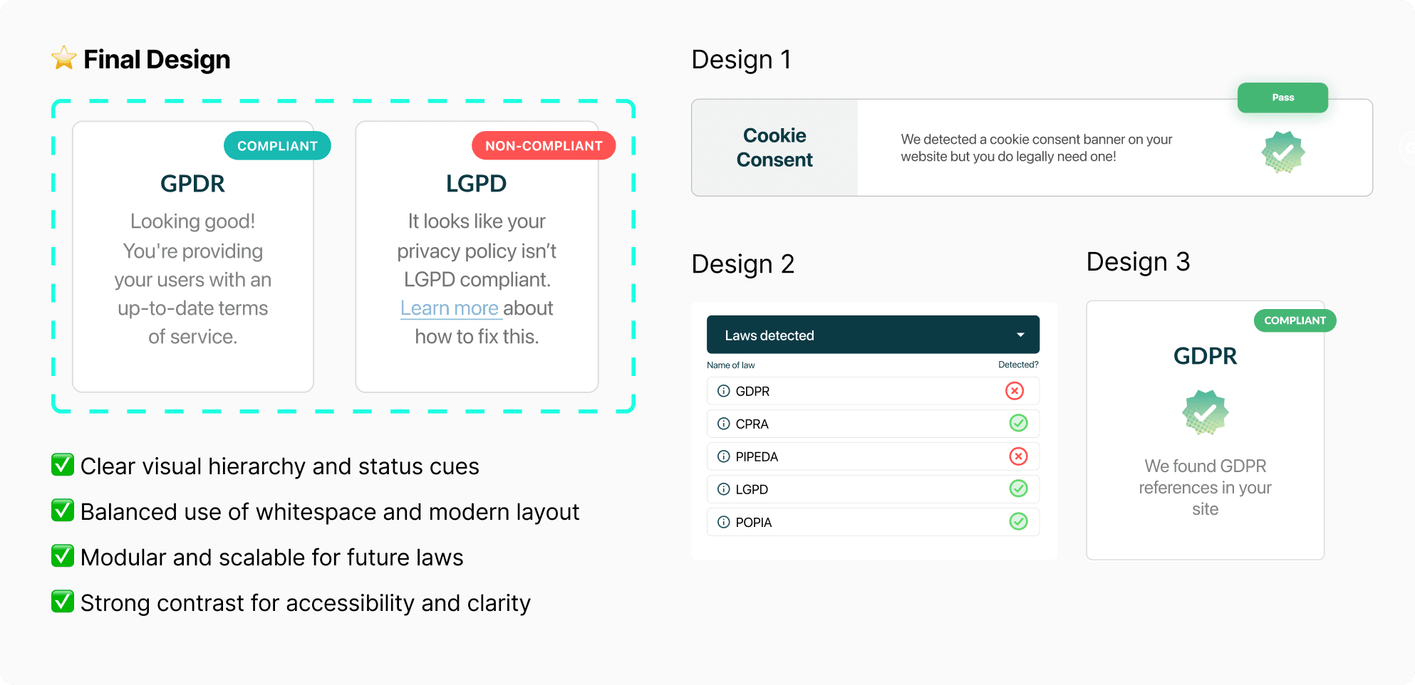 This set of drop-down menus will effectively communicate to the user the specific regional laws that have been identified on their website. The laws will be categorized as either "detected" or "undetected," providing a clear and organized representation. This simplistic approach aims to help users easily understand and identify areas for improvement.
