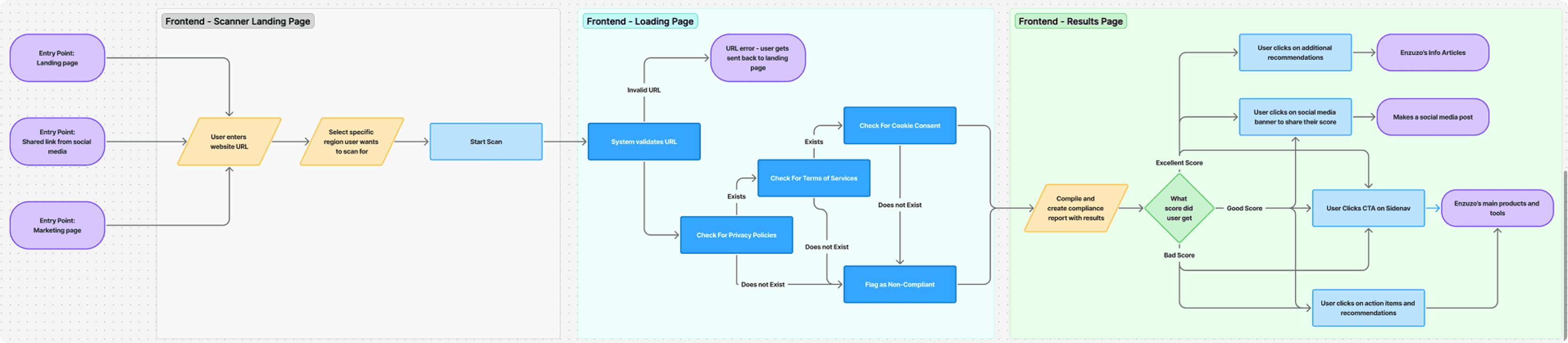 At a high level, I defined three primary entry points: the landing page, a social media post, and the marketing site. Regardless of the entry point, users are directed to the landing page to input their information, followed by a loading page where the backend processing occurs, and finally the results page where insights are surfaced.