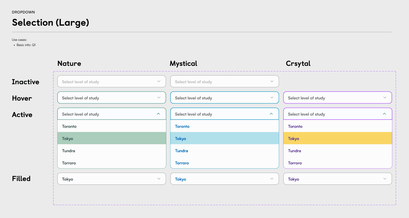 I wanted to ensure all necessary interactions were captured in our designs, including hover, inactive, and active states, to make the experience feel complete and intuitive. With these states and variations for each realm, this resulted in a large number of variants, ultimately contributing to a comprehensive and flexible design system.