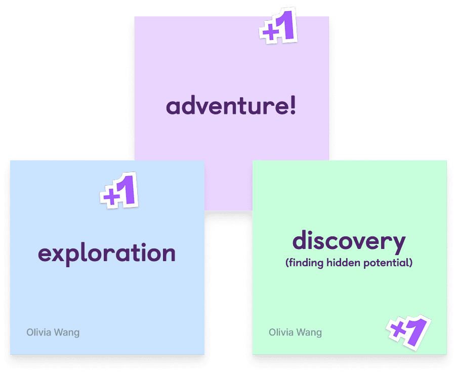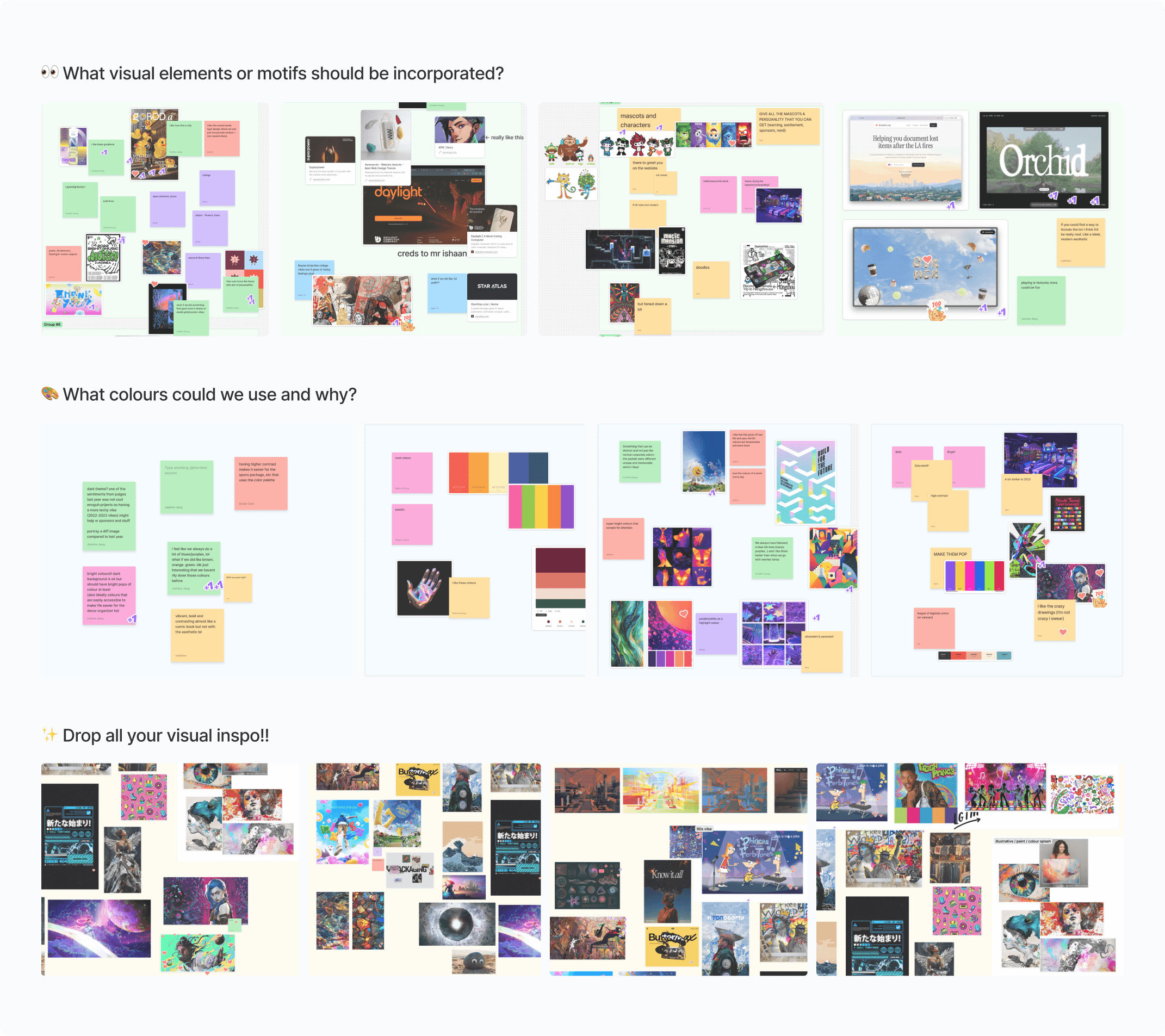 To kick off our visual theme, all 48 organizers jumped into a FigJam board to paste and jot down any inspiration that came to mind. We also prepared a few prompts to help guide the type of ideas and inspiration we were looking for.