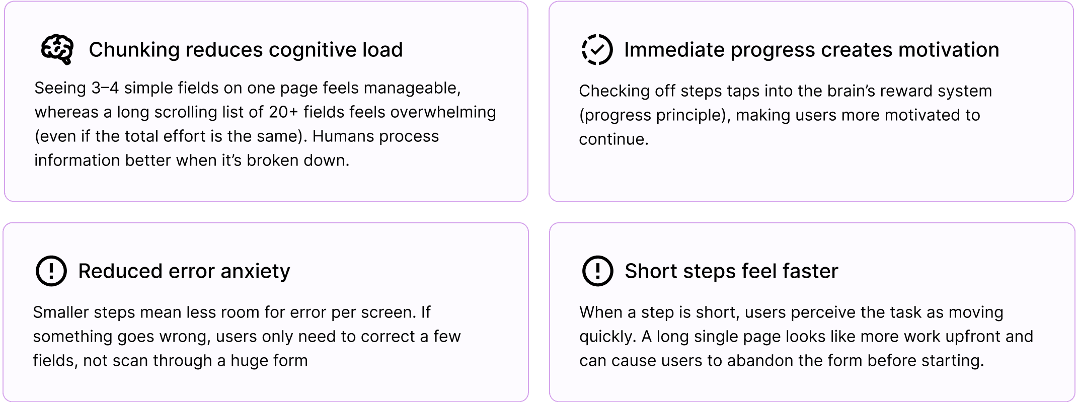 The final design combined navigation and progress into one seamless component, giving users the ability to move between steps while always knowing where they are. This approach reduces: