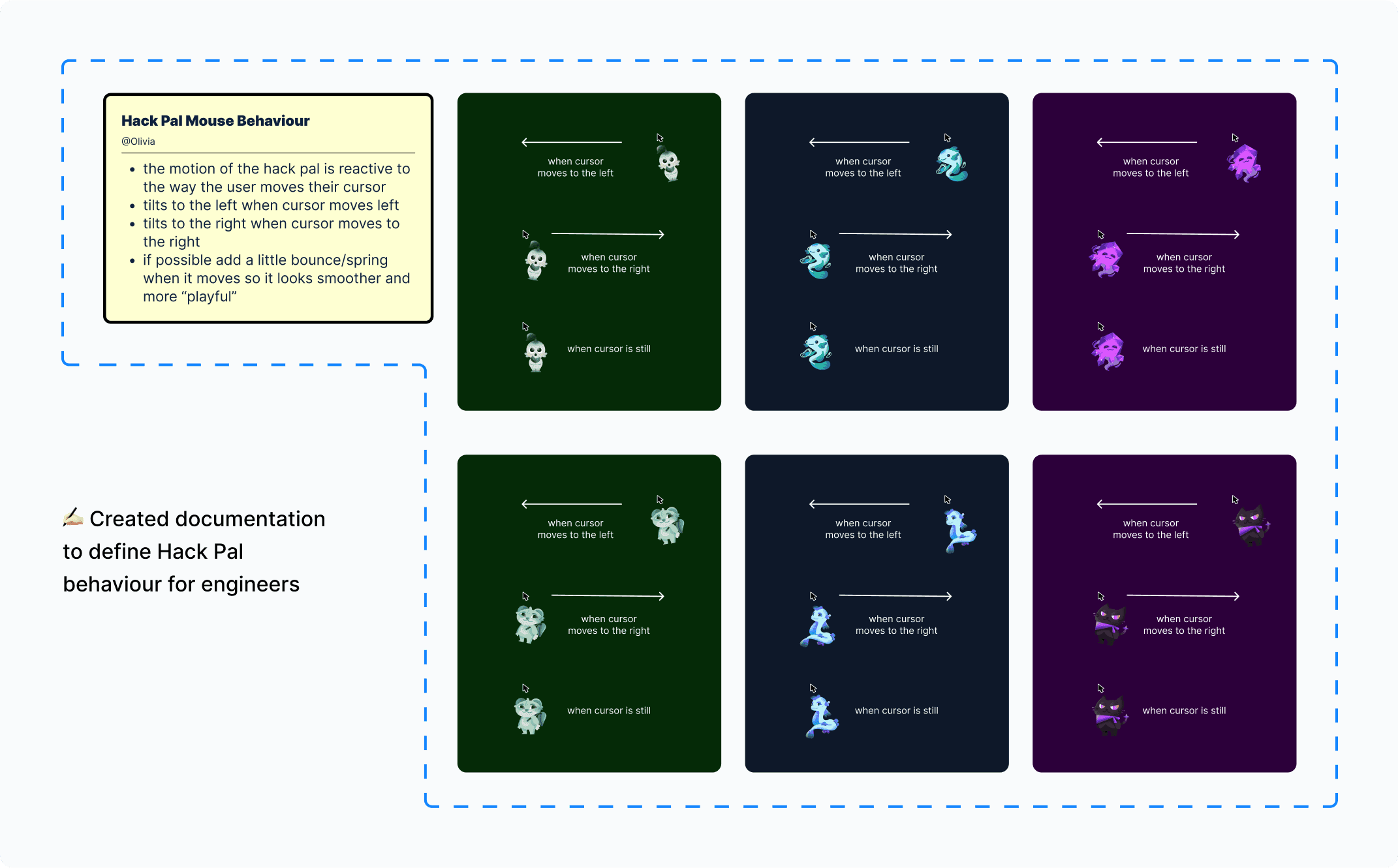 I designed the HackPals to always feel responsive and alive, reacting instantly to user interactions like hover or idle time. At the same time, I prioritized user control: they could dock, minimize, or move their pal aside if they found it distracting. Personality and interactions were revealed gradually (progressive disclosure), helping users build a relationship with their pal without cognitive overload. Accessibility was also considered, ensuring animations respected reduced-motion preferences and maintained strong contrast.