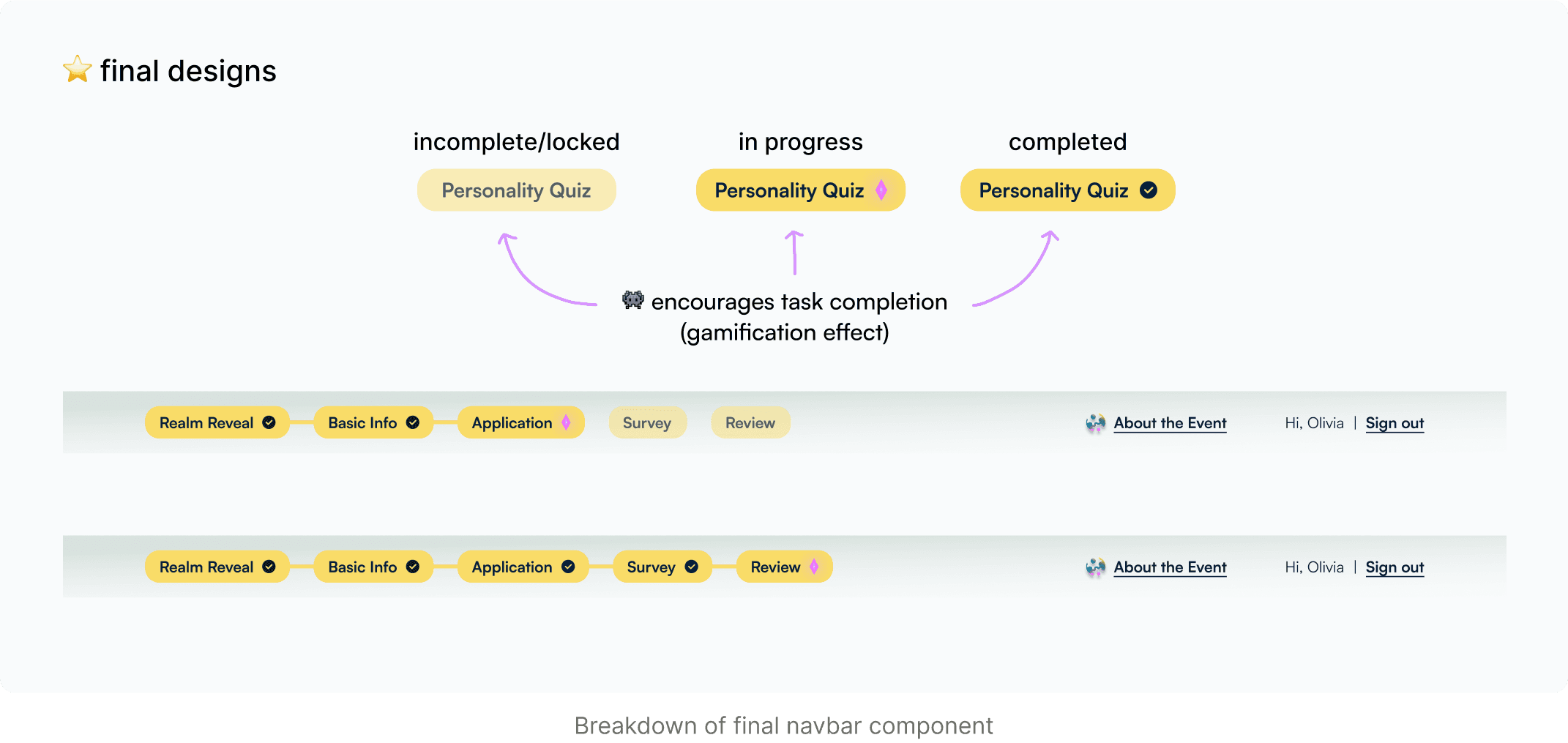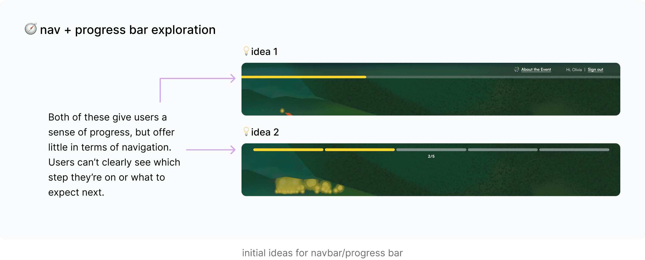 When mapping out the components, a progress bar was essential to give users a clear sense of where they were in the application. At the same time, I needed a top navigation bar to hold key actions like sign-out and account access. My goal was to design something intuitive, minimal in screen space, and fully aligned with the visual theme of the experience. My first explorations focused on simple progress bars that only indicated which step the user was on. These were designed as a separate component from the navigation bar, but ultimately felt too plain and disconnected.